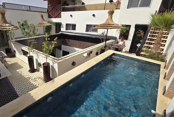 Parmi les atouts majeurs du Riad Dar Najat, on retrouve la piscine chauffée installée sur l'une des deux terrasses. Elle vous invite à la détente avec une vue panoramique sur la médina et les montagnes de l’Atlas. Parfait pour se relaxer après une journée de découvertes.
