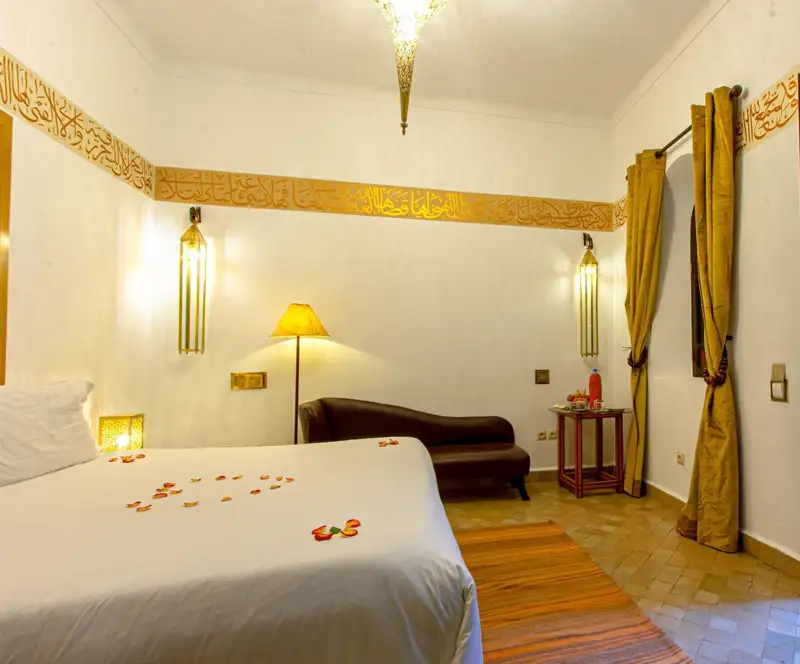 Dès votre arrivée, vous serez séduit par le charme traditionnel et l’ambiance chaleureuse du riad. Les chambres, décorées dans le respect du style marocain, sont toutes équipées de climatisation pour votre confort. Le Wi-Fi gratuit vous permet de rester connecté tout au long de votre séjour.