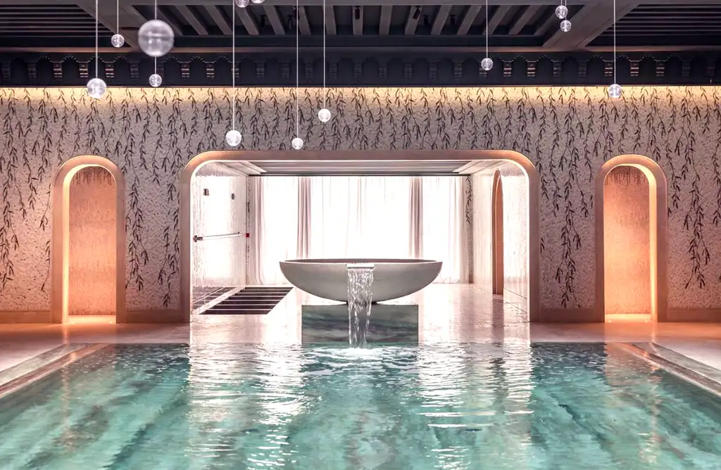 Cette majestueuse piscine de 80 mètres de long offre une vue sur les écuries privées de l’hôtel. Le spa Chenot propose des soins holistiques d’exception.
